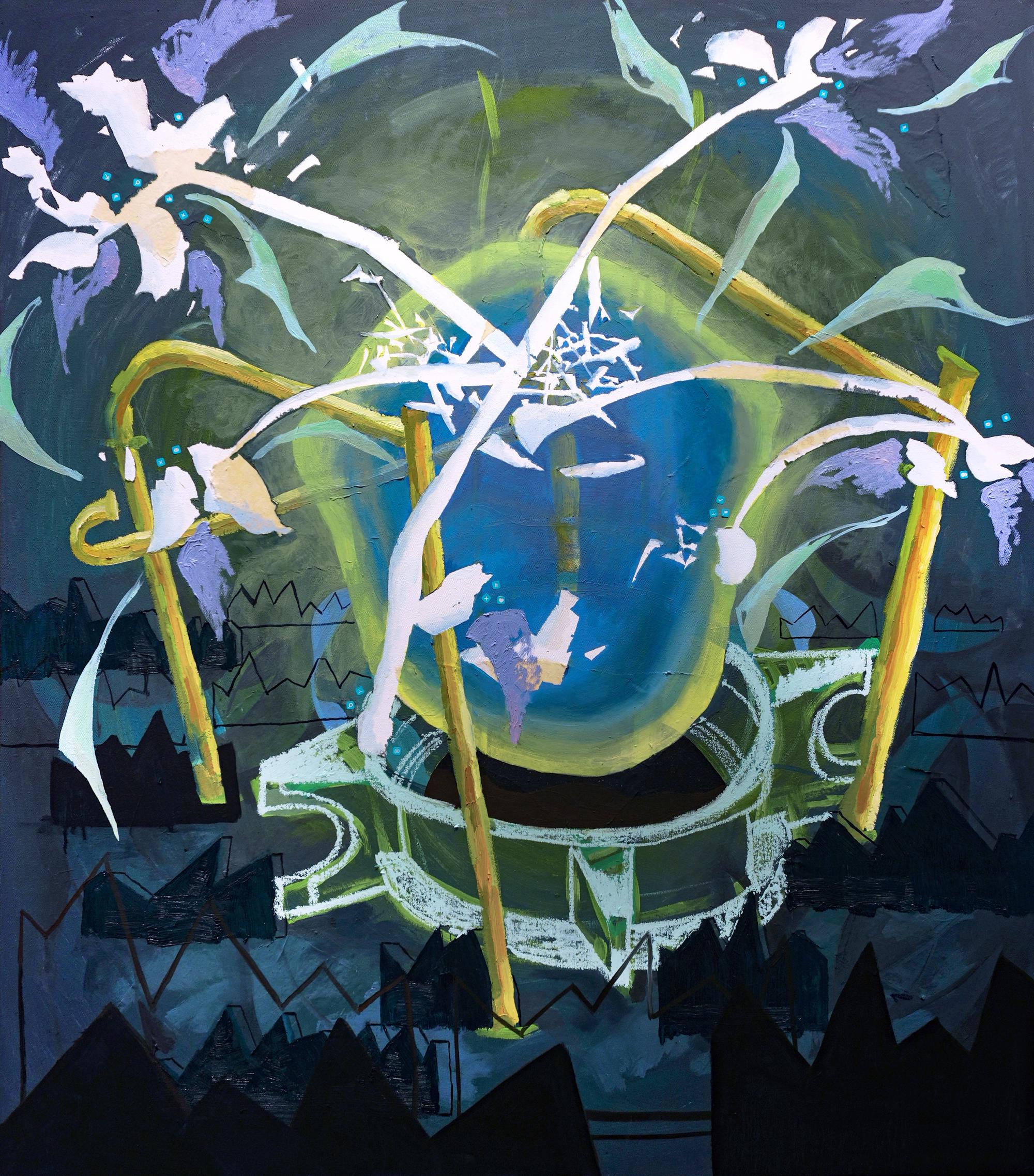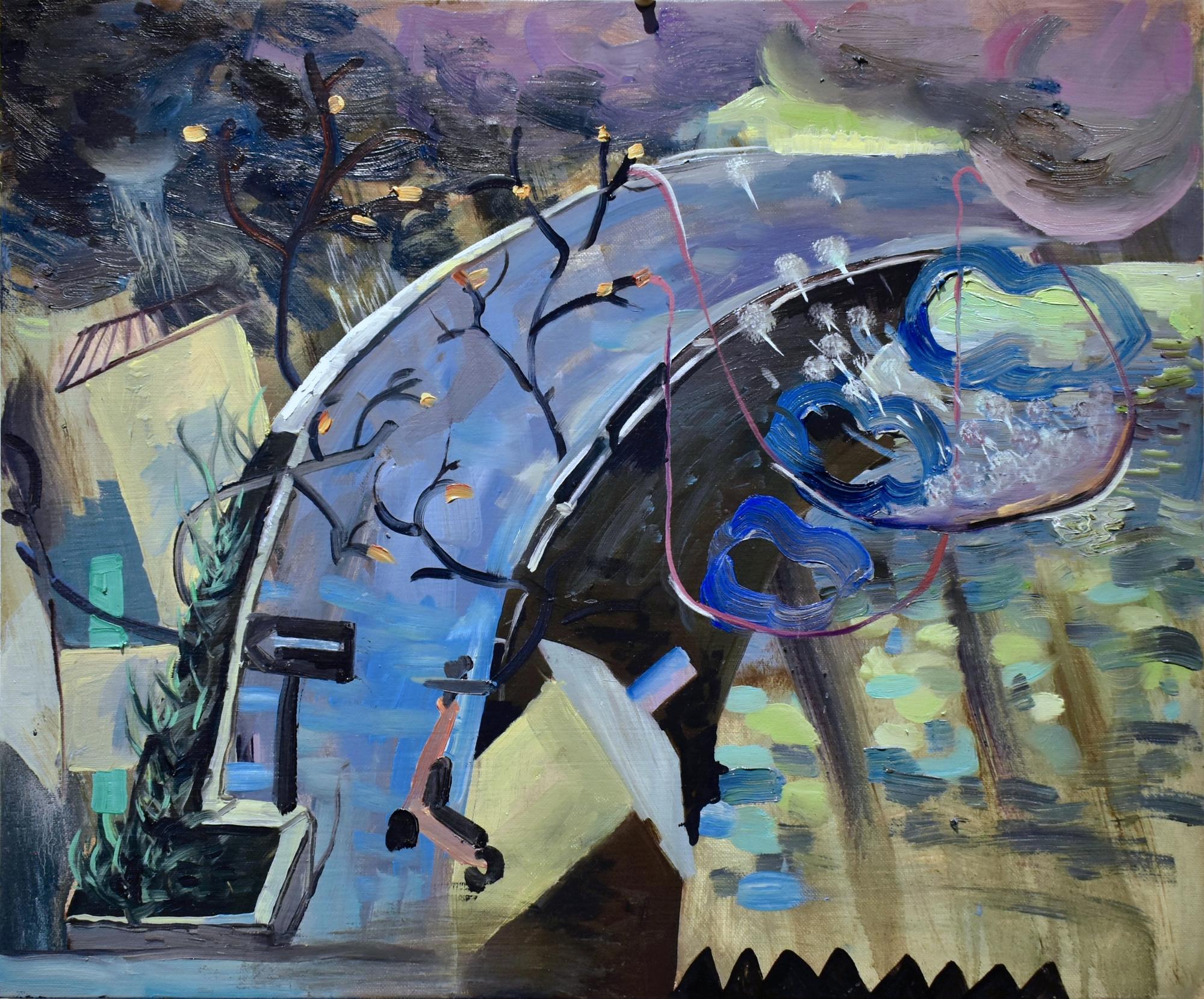 This painting is based on a construction-site sewer access opening, a structure meant to remain hidden and purely functional. The central circular form echoes the manhole, while branching white lines interrupt it like a sudden arrival or message.