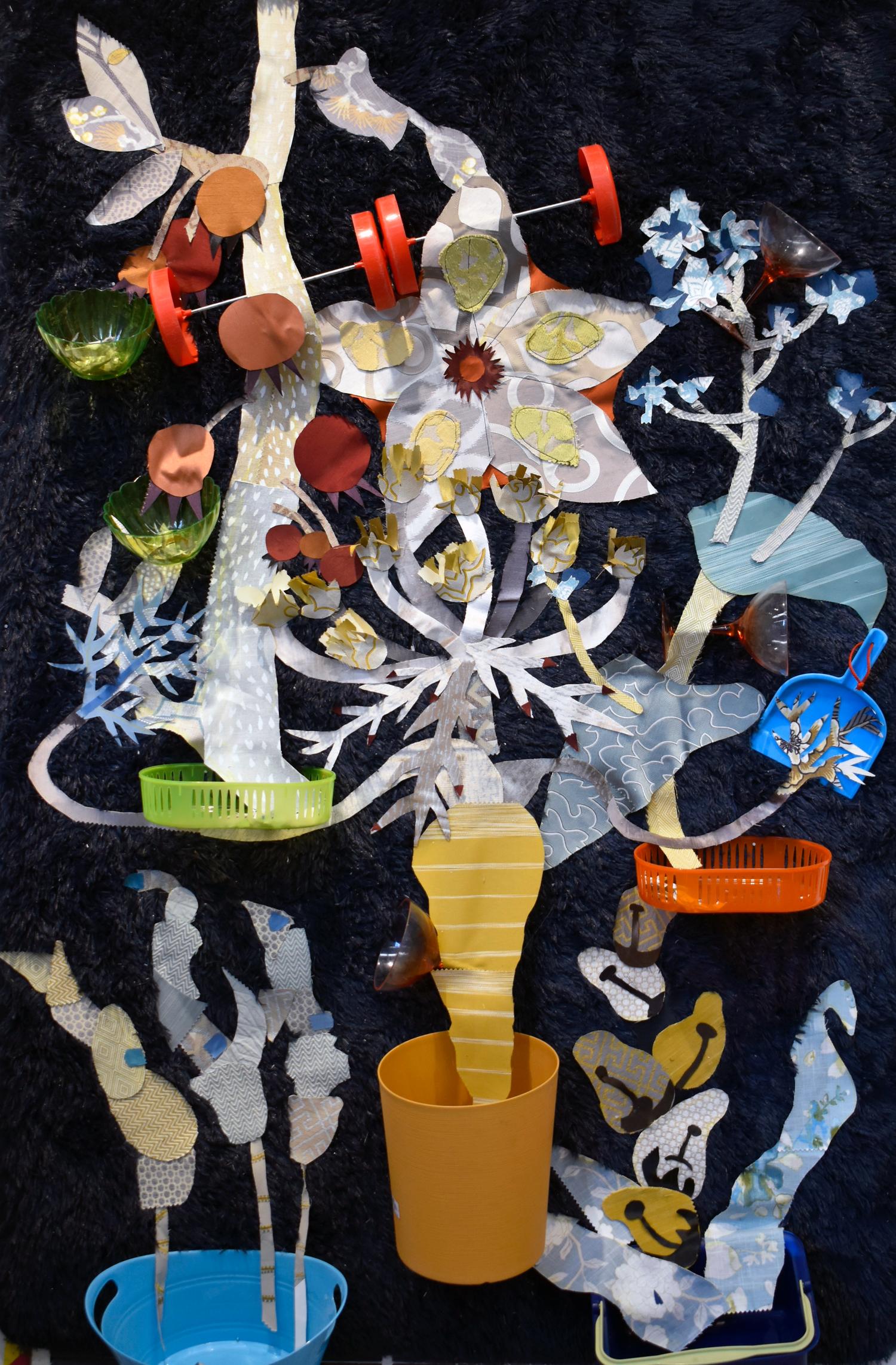 Area rug, fabric samples, found kitchenware