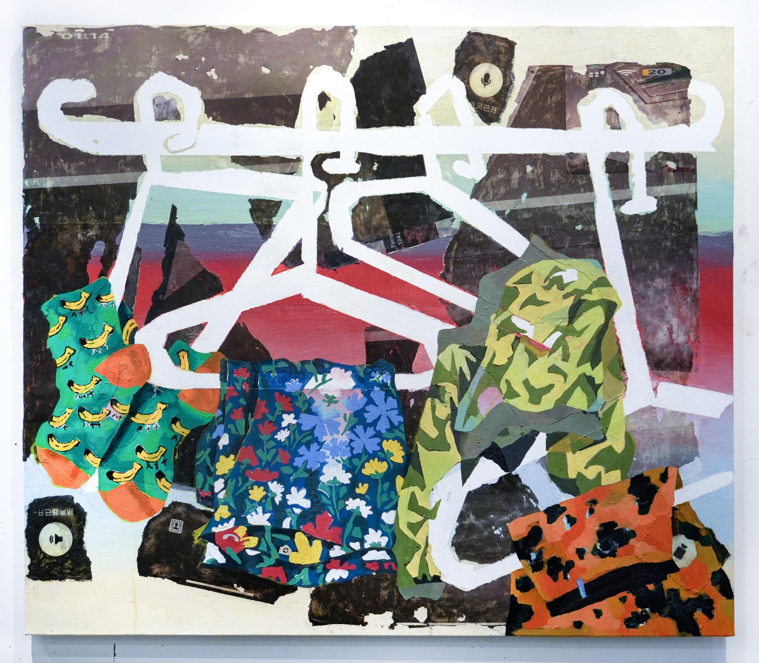 This work uses image transfers of FaceTime screenshots as its background, all without a visible person in the frame. Over these empty interfaces, fragments of patterned clothing appear as if mid-change, suggesting an attempt to adjust one’s appearance for the screen.